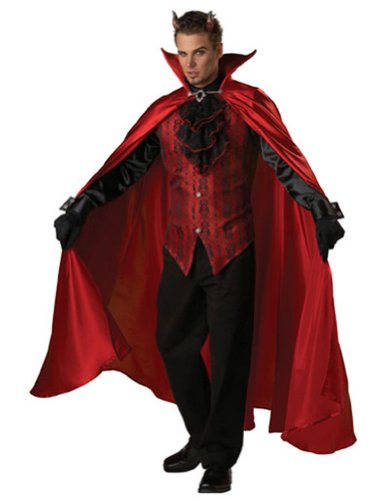 Devil Handsome Medium : Full length red satin cape, brocade vest with attached lace jabot and jeweled medallion, black gloves, and deluxe vinyl devil horns. Pants not included. This costume is made from higher quality materials and could be considered rental quality. Each costume is packaged and shipped to you in a handy folded, reusable garmet bag for easy storage.