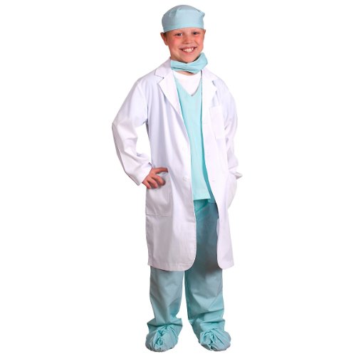 The Dr. will see you now. Includes: White Lab Coat. Real working stethoscope. Scrub set with hat, mask, top, bottom&shoe covers all for that sterile look in the operation room. ** For safety reasons the stethoscope is not included with the size 2/3.