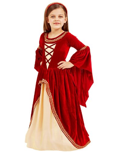 Any young lady of the Renaissance would have been proud to wear a dress like this Alessandra the Crimson Princess Costume! It's made of luxurious fabrics and trimmed with rich-looking braid. It's truly fit for a princess. – 100% polyester crushed velvet, taffeta & knit mesh fabrics – Red crushed velvet pullover dress has elastic back waistband – Bodice inset & skirt front panel are peach taffeta – Neckline, wide hanging sleeves & overskirt are trimmed w/ metallic red & gold braid – Built-in hoop petticoat of peach knit mesh – Velvet-covered headband trimmed w/ metallic braid