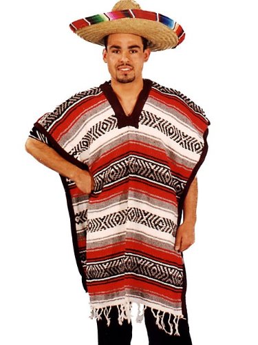 A Mexican poncho is an outer garment designed to keep the body warm. It was created by the ancient peoples of the Andes. Poly cotton blends material with black binding on the edges. Multi-color, striped poncho.