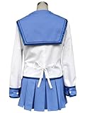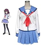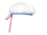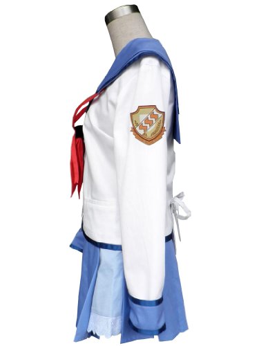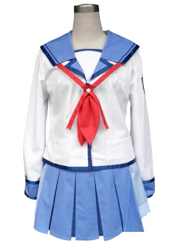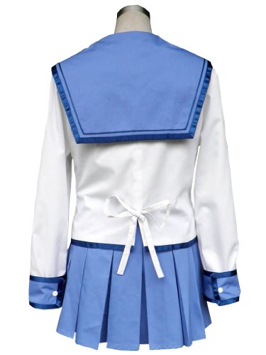 This costume includes a white, long sleeved sailor fuku style top. The collar is a light blue with dark blue trim, just like the cuffs of the sleeves. A triangle cut on the bottom middle of the front of the uniform is present, as well as a dark blue trim along the bottom. On the left sleeve, the school patch is carefully ironed on. Around the collar is a red ribbon and a light blue pleated skirt is included to complete the school uniform look. A black head band with a green bow and a white hat with a blue trim and pink ribbon are included as well so you can look just like Yurippe! Fight the system and beat Tenshi with this fun and exciting cosplay costume.