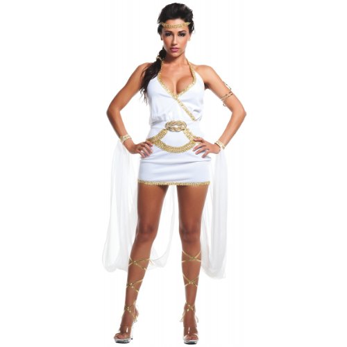 The Mighty Aphrodite Goddess Of Love Costume includes the mini dress, arm draps and the head band.