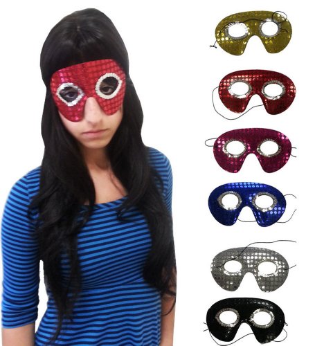 Traditional face masks with shiny sequins and elastic band. Made of plastic and fabric. Asst. colors. Size 3½” T. x 6 ¼” W. There are a dozen assorted masks in a pack.