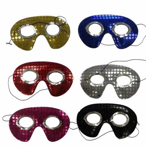 Traditional face masks with shiny sequins and elastic band. Made of plastic and fabric. Asst. colors. Size 3½” T. x 6 ¼” W. There are a dozen assorted masks in a pack.
