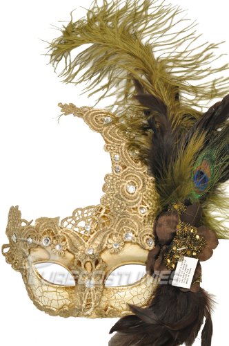 Baroque Lace Venetian Mask (Ivory) is a beautiful crescent shaped mask with a painted cracked shell detail and a gorgeous lace applique trim. With peacock feathers and a delicately placed flower gracing the side of the mask it is a vision of true femininity.