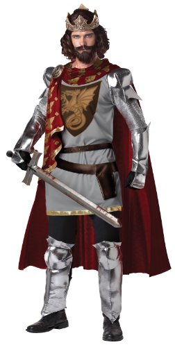 The fabled king of england is ready for battle. The king arthur costume includes tunic, velcro on shoulder guards, crown, cape with medallion pin, double loop belt, gauntlets, and leg guards. Shoes, pants and sword not included.