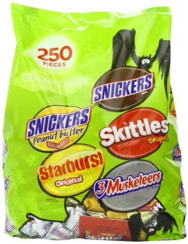 A bag filled with snickers fun size, snickers peanut butter fun size, 3 musketeers fun size, skittles fun size and starburst fun size. The perfect mix of all of your favorite brands.