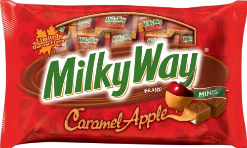 With all the flavor of a red delicious apple dipped in a melted caramel-and-chocolate concoction, this miniature milky way spinoff is a delicious festive treat. Each bite-size bar encases a ribbon of apple-infused caramel laying delicately over a hunk of chocolate-malt nougat in a soft milk chocolate shell.