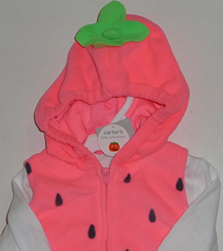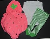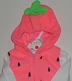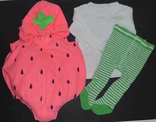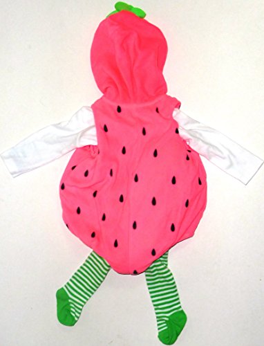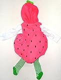 The three-piece set includes a pink microfleece lined costume with black “seeds” and stem on hood, white long-sleeve top and green and white striped tights. The hood has elastic around the face, and the outer top has a lightly stuffed belly and bottom.