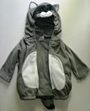 The costume is two pieces with a zipper on the long sleeve top and a hood with the raccoon's head. Grey pants finish the costume. The top is gray with a white belly, a grey hood with dark grey raccoon mask and appliqued face and ears; the back has a grey striped tail. The hood has elastic around the face. The long sleeve top has lightly stuffed belly and bottom and is a soft velour fabric.
