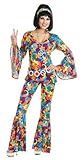 The Women's Gold Gate Gal Costume is a colorful retro outfit that will have you looking spectacular for any Halloween party, costume party, or if your groovy enough around your own home. The complete outfit includes bright floral print flared pants, matching top with flared sleeves and headband. The outfit comes in a variety of sizes including: small, medium, large, to guarantee a comfy fit. This costume is one of our most coolest in stock and at such a low-cost price it's sure to be a great purchase this Halloween. Shoes are not enclosed with the outfit but our Hippie Sandals For Adults will look fantastical with the costume. You can add to the look with our large assortment of accessories including: Super Deluxe Glitter & Jewels Hippie Makeup Kit and Gold Peace Sign Necklace.