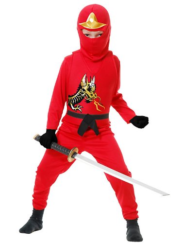 Let you child feel the power of the dragon as he kicks some butt in this red ninja costume. Be sure to pick up some ninja weapons for your little guy to complete his look. – 100% Polyester – Red pants and shirt – Polyfoam red vest with an attached belt – Printed on black and gold dragon – Matching red hood with a gold patch above the eye hole