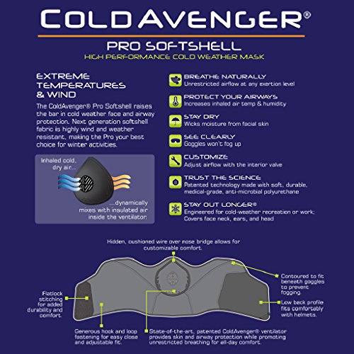 The ColdAvenger Pro Softshell is the most high-performance face mask we offer and will provide the perfect level of protection for any wintertime adventure. The ColdAvenger ventilator is made of a soft, medical grade, anti-microbial polyurethane plastic. The patented design allows you to breathe freely while keeping your airways protected and relaxed with warm and humidified air. Built with a hidden “nose-wire” and generous hook & loop closure to allow for a custom fit and near universal sizing. Wear a ColdAvenger . Stay out longer !