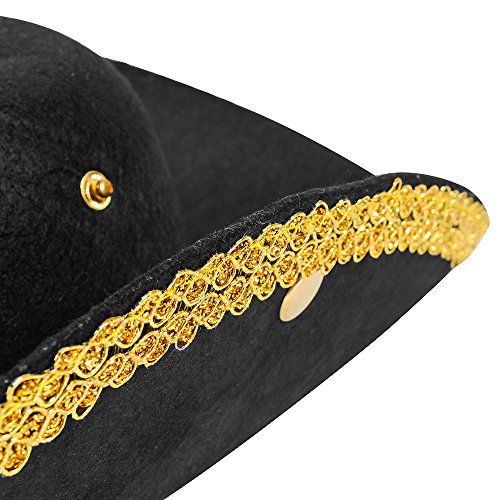 The Black And Gold Colonial Style Tricorn Adult Costume Hat completes your distinguished colonial look.