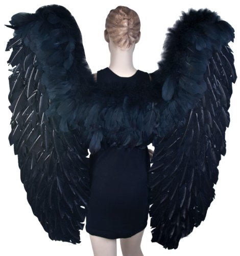 These black feather angel wings are the perfect addition to any dark angel costume. These wings are fairly large measuring 37″ x 40″ and they are worn with two comfortable shoulder straps. One size fits all.
