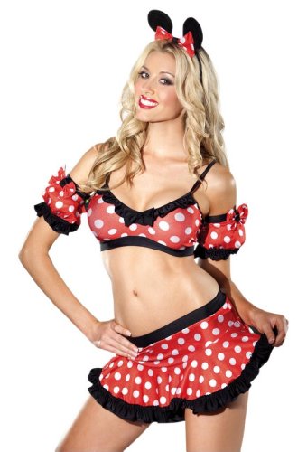 Costume comes with 4 pieces which includes a red polka dot top and matching mini-skirt, arm sleeves and mouse ears headband. Comes in two sizes: S/M (Dress Sizes 4-8) and M/L (Dress Sizes 8-12)