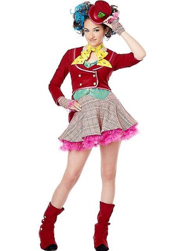 Aptly dressed for a marvelously mad tea party. This fun costume includes a burgundy coat with attached faux vest, skirt with attached pettiskirt, bow tie, glovelettes, mini hat with card and spat shoe covers. Shoes and hair extensions not included.