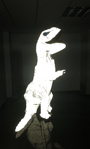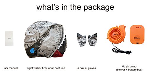 Night Walker Style Jurassic T-rex Inflatable Costume operated by blower. Approx. 220cm (7'2) tall after fully inflated. Give it some flash light to help and make it be an amazing night king t-rex. 100% polyester 4 x AA batteries to operate one set air pump / new and good quality batteries keep air pumping for around 2 hours