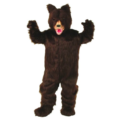 Brown, shaggy acrylic faux fur jumpsuit with matching mitts, feet, and oversized head. One size fits most adults. Copyright Alinco Inc.