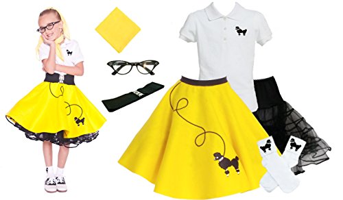 - This 7 Piece high quality Poodle Skirt outfit comes with the following items: Poodle Skirt, petticoat, polo, chiffon scarf and an elastic cinch belt