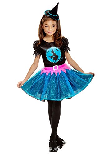 Adult Light Up Witch Child Costume- Black/Blue: Large (12-14). This costume includes dress and mini hat headband. Does not include tights or shoes.