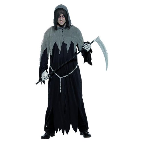 Hochwertiges Sensemannkostüm in Schwarz/Grau, bestehend aus der Robe und der Kapuze.