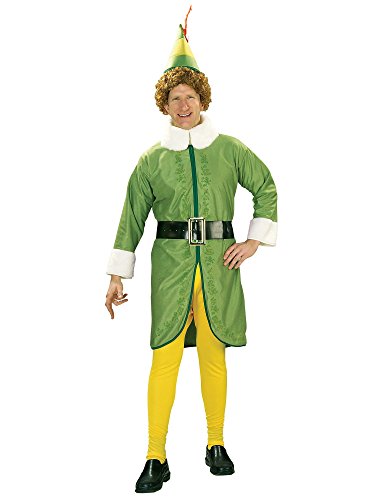 The movie Elf was a tale about Buddy the Elf and his adventures trying to find his real family. The Adult buddy the Elf Costume features a green Santa's elf style jacket with white cuffs and collar. It has a belt with oversized buckle, yellow tights, and a pointed green and yellow elf hat with a red feather. Shoes and wig are not included.