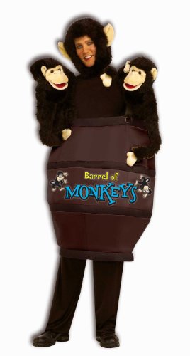 Barrel Of Monkeys costumes includes barrel, headpiece, and two monkey hand puppets. Available in one size, Adult Standard. Shirt, pants, and shoes not included.