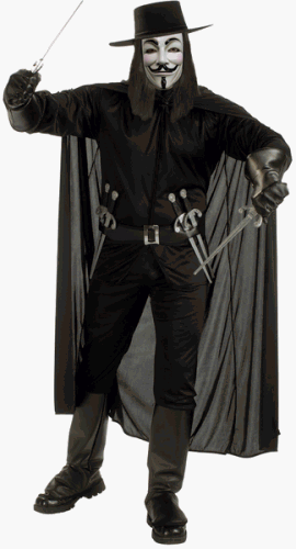 - The V for Vendetta costume includes shirt, pants, cape, boot tops, hat, mask & belt with 6 daggers.