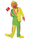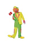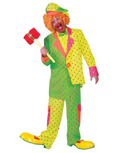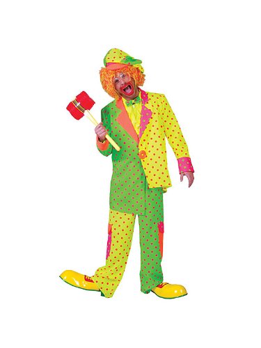 You're sure to entertain in the Men's Pokey Dot Clown Costume. This costume features a yellow, green, pink and orange jacket that is longer on one side than the other, is covered in pink and green polka dots, and has a large orange button in the center. It also includes a pair of coordinating pants with large side pockets and pink polka dots, a matching floppy hat, and a green bow tie with pink polka dots. Let out your inner goofball at your next Halloween party, or get ready to entertain at a kid's birthday party. You can complete the look with Red and Yellow Clown Shoes Adult, Clown Horn, Tri Color Palettes Clown and Cotton Clown Gloves White, sold separately on our website. You'll look like you walked over from the local carnival when you wear this outrageous outfit.