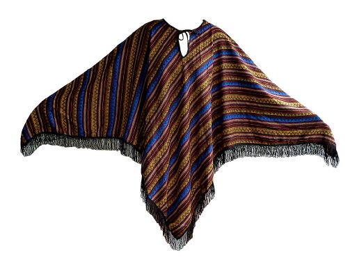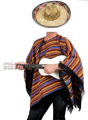 Dazu gehört ein toller bunter Poncho mit Fransenborde und ein schöner bunter Sombrero.