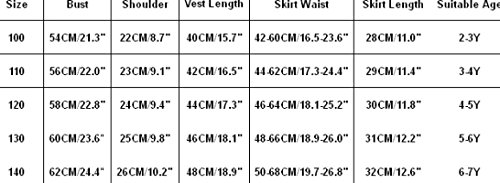 - Suitable Age:4-5Y—-Bust:58CM/22.8inch—-Shoulder:24CM/9.4inch—-Vest Length:44CM/17.3inch—-Skirt Waist:46-64CM/18.1-25.2inch—-Skirt Length:30CM/11.8inch