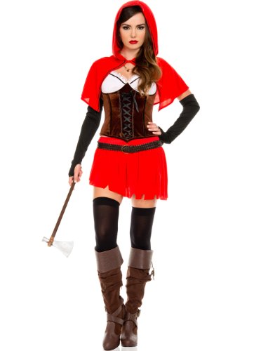 6 piece velvet lace up bodice with asymmetrical skirt. Includes hooded cape, extra long arm warmers, belt and tomahawk. Boots and thigh hi not included.