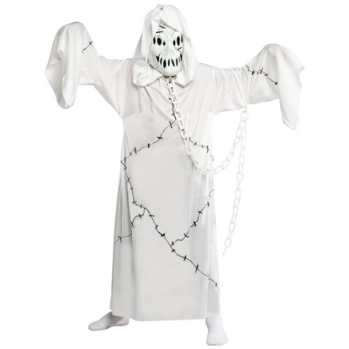 Sizes for this costume are: Small: Age 3 to 4 years, Medium: Age 5 to 7 years, Large: Age 8 to 10 years . Kids Halloween costume includes three pieces and is a scarily good bargain. Costume includes white hooded robe with oversized bell drape sleeves. The robe has a printed stitch decal covering the entire garment. An original take on a typical costume, you'll be sure to stand out with this line. Completing the costume we have an EVA facemask with attached elastic strap, netted eye and mouth holes plus stitch design on the forehead continuing the theme. The third piece comprises of a PVC chain about four and a half feet long and can be tied around body parts or just held as an accessory.
