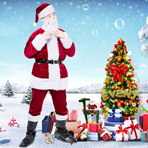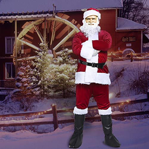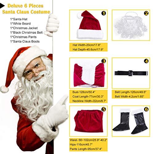 • 🎅Santa Suits Package – Deluxe 6 Pieces Santa Outfit -Jacket, Pants, Hat, Beard, Black Vinyl Belt, Boots. Friends, family, and the kid inside everyone will enjoy a visit from Santa.