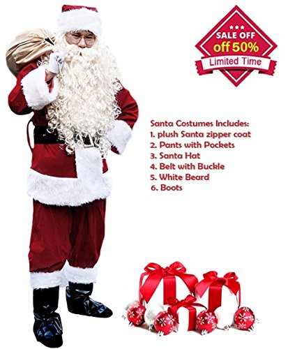 - 🎄 🎄[WHAT YOU WANT]:Complete deluxe Santa Claus costumes with exquisite plush and it trimmed with luxurious white longhair plush and completely lined. you can make a visit from Santa an annual tradition, packaged in a reusable storage bag. High quality Santa suit you'll enjoy wearing for years to come It will be a funny accessory and will pay anyones attention!