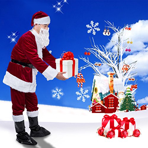 - 🎄 🎄[HIGH QUALITY&HEALTHY]: Deluxe Christmas Santa Suit is made of high quality material. breathable, warm and comfortable, skin-friendly, be healthy for your body. The Overalls Santa Suit is a top-of-the-line suit that includes pullover coat, matching pants with pocket, Hat, buckle, white beard. This suit is a great choice for Santa's who want the ability to take off the coat and still look like Santa while remaining cool