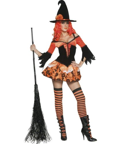 Taglie disponibili: Small: Taglia: 40 – 42, Busto: 87 – 90 cm, Vita: 67 – 69 cm, Fianchi: 93 – 96 cm, Medium: Taglia: 44 – 46, Busto: 93 – 97 cm, Vita: 73 – 77 cm, Fianchi: 100 – 104 cm. Il Costume da Strega Giardiniera per Halloween comprende un corto e sexy vestito in nero e arancione con maniche sfrangiate e gonna con fantasia floreale.Nel completo da strega in arancione è inoltre incluso un cappello coordinato con nastro arancione e motivo floreale.