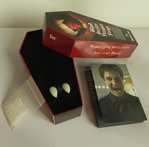 chieben Sie zuerst einen Zahn bis zu den Rasten über den eigenen. Eventuell oberen Teil abfeilen oder mit kleiner Schere abschneiden, damit er das Zahnfleisch nicht berührt. Einen Teil der weißen Kügelchen auf einem Löffel in heißem Wasser schmelzen, bis die Masse klar ist. Dann zu einer Kugel formen, in den Vampirzahn drücken, auf den eigenen Eckzahn stecken und einige Sekunden fest pressen. Rasch das beidseitig heraustretende Material mit der Fingerspitze auf die Nachbarzähne verstreichen und etwa 2 Minuten festhalten. Jetzt abziehen und in kaltem Wasser aushärten lassen. Machen Sie das Gleiche mit dem zweiten Vampirzahn. Falls Sie mit dem Ergebnis unzufrieden sind oder die Abformmasse zu schnell kalt wurde, wärmen Sie sie erneut auf. Nun können Sie die Draculazähne immer dann anziehen, wenn Sie auf Beutefang gehen … Bei eingesetzten Zähnen bitte nichts essen oder Warmes trinken. Eine bebilderte Anleitung (englisch) liegt bei.