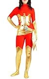 The catsuit features its dark Phoenix pattern in the front and special designed golden belt.On one hand,the combination of golden and red color makes people remember the characters of X-Men or some Network games,while the shiny metallic material is so elasitic that it fits you very much,no matter what shape and size you are.At the same time,the unisex design can catch most people's attention because it can help you save much money.In addition,the soft and breathable of the catsuit and distinctive finger part design make you feel comfortable.Thus,considering it high quality,it is worth having.