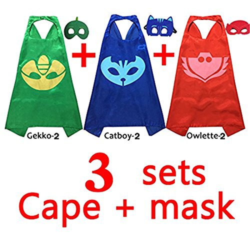 The perfect gift for your young hero! Pack of the three Catboy Owlette and Gekko. Comes with a cape and mask for each. Capes are high quality double sided satin. They are made to withstand many years of active play and Superhero Battles! Easy velcro neck fastener for younger children. Masks are also high quality, made of felt and comfortable to wear. Perfect to have on hand for active boy play dates! Capes are approximately 24″ tall by 26″ wide. Masks measure 6 1/2″ wide and 3 – 4 1/2″ tall. Hand wash capes in cold water and air dry.