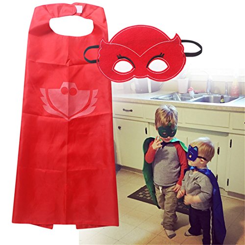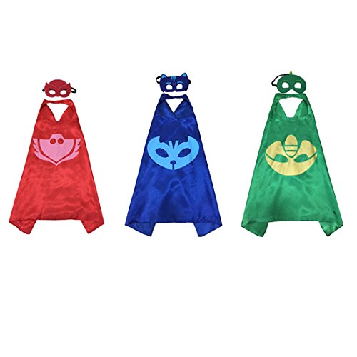 The perfect gift for your young hero! Pack of the three Catboy Owlette and Gekko. Comes with a cape and mask for each. Capes are high quality double sided satin. They are made to withstand many years of active play and Superhero Battles! Easy velcro neck fastener for younger children. Masks are also high quality, made of felt and comfortable to wear. Perfect to have on hand for active boy play dates! Capes are approximately 24″ tall by 26″ wide. Masks measure 6 1/2″ wide and 3 – 4 1/2″ tall. Hand wash capes in cold water and air dry.