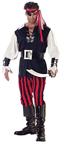 Perfect for pirating on the highseas or anywhere a scurvy pirate is needed. Shirt, pants, head tie, boot tops, belt, and wrist cuffs. Sword not included. Large size fits sizes 40-42.