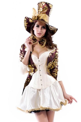 The five-piece, Deluxe Tea Party Hatter costume includes a burgundy and gold filigree print jacket with gold cuffs and collar, built-in corset with boning and busk front closure, button details, large bow back with tails, mini gold skirt with ruffle trim detail, extra large bow tie and large top hat with bow,also include Boot toppers.