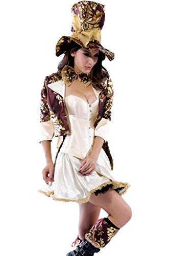 The five-piece, Deluxe Tea Party Hatter costume includes a burgundy and gold filigree print jacket with gold cuffs and collar, built-in corset with boning and busk front closure, button details, large bow back with tails, mini gold skirt with ruffle trim detail, extra large bow tie and large top hat with bow,also include Boot toppers.