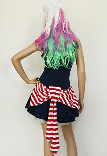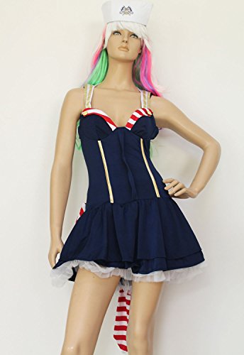 Grab their attention with this sexy sailor stunner. Our 2pc Pin up Sailor Body Shaper Costume is a corseted, navy halter dress featuring gold accents and a white sailor collar with an attached bib that drapes over the shoulders, navy contour dress with built in body shaper to give an overall slender look and a lifted bust and posterior. Accessorize with the included white hat as well as the large red and white bow to wear on the back of the dress, and you're ready for your close-up.