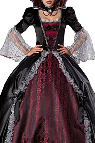 Trying to become the ruler of the Halloween party is hard work. You have to prove that you of royal blood and a direct decedent of the Sun King, and you still must prove diplomatic skills. I say skip all of that and just rule the castle at night in this Splendid Vampire Dress Halloween Costume with neckpiece wholesale popular among customers.Size (CM): One Size: Bust 84-92, Waist 68-80, Shoulder 70-72,Cuff 48-54,Sleeve 59,Length Top 155(cm)