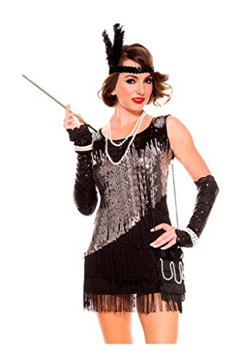 This two piece black fringe flapper dress features an asymmetrical design with contrast silver sequin body and a feather embellished headpiece. Sequin gloves and cigarette holder not included. Special made for cosplay and clubbing time.