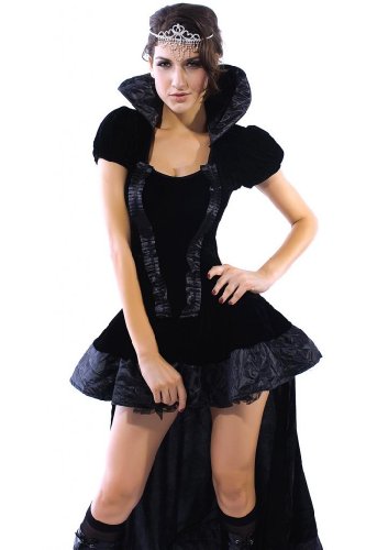 Wicked Queen costume includes a mini dress with an attached bustle and train, a velvet gown with lace-up detail and satin quilting, stay-up collar, puff sleeves, dual length skirt, ruffles. The bodice has corset lacing in the back.