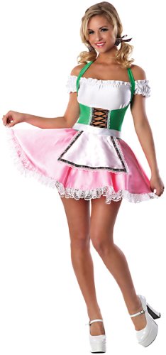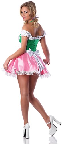 Whether you're serving beer, yodeling, or just standing there looking good – the beer's on me costume is a sexy choice. dress has a green tie halter top, pink skirt with lace trimmed tulle underskirt, and removable apron with bow in back. dress is made of polyester and form-fitting spandex. available in sizes: xs/s fits 0 to 2 dress, 30 to 34-inch bust, 22-inch waist, 32-inch hip and 90 to 95-pounds; s/m fits 2 to 6 dress, 32 to 34-inch bust, 24 to 26-inch waist, 34 to 36-inch hip, and 100 to 130 pounds; m/l fits dress 6 to 10, 36 to 38-inch bust, 26 to 28-inch waist, 36 to 38-inch hip, and 130 to 150-pounds; l/xl fits dress 10 to 14, 38 to 40-inch bust, 28 to 32-inch waist, 38 to 40-inch hip, and 150 to 170-pounds. hand wash, cold water; do not bleach; dry flat; do not iron. delicious sexywear of new york is a division of rubie’s costume company, the largest costume designer and manufacturer in the world. delicious costumes are designed and crafted with high quality fabrics and trims for superior fit and style.